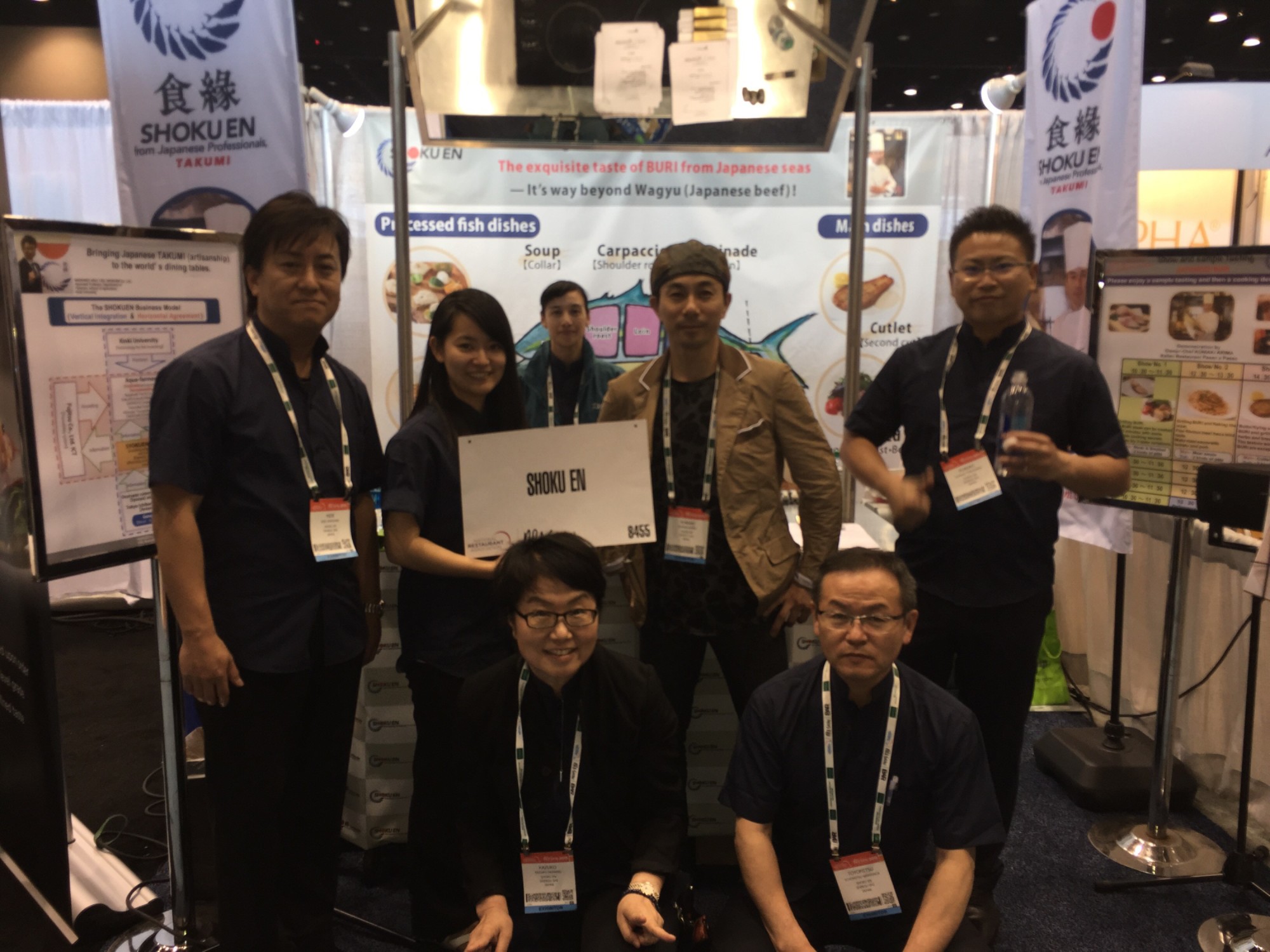 今回の展示目的は、食縁が日本近海で養殖するブリ(Yellowtail)を、寿司や刺身以外の食べ方を通して広く米国内に広めようという趣旨で始まりました。日本からイタリアン料理の有馬シェフ(レストラン「Passo a Passo」オーナーシェフ)を招き、ブリを使った様々な料理サンプルを会場内で振舞いました。 UNIVA America, Inc.は、この食縁のブースにおいて、デモをより効率的に見せるブース構成アドバイス、 各種什器製作、セットアップから展示期間中のサポートまで総合的なサポートを行いました。